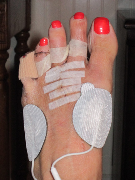 My recovery has gone from the beginning sharp pains of post-surgery to the pain of the long term healing process of bones. I have implants comparable to the “My Toe” implants advertised on television, in three of my toes. I have screws holding bones in two of the metatarsals and a repair of the plantar plate. (I’ve certainly learned a lot about structures in the foot since this whole ordeal started.) One of the treatments offered me is the “TENS” unit, or transcutaneous electrical nerve stimulation. In fact, coming out of surgery, the electrode pads had already been applied to my foot beneath my bandages and my TENS unit was delivered to my house the next day. According to the instructional book that came with my unit: “TENS devices deliver electrical pulses through the skin to the cutaneous and afferent (deep) nerves to control pain.” It further describes the use as “when the body is injured, both pain and non-pain impulses are sent to the brain from the nervous system. These pulses travel through the cutaneous nerves to the deeper, afferent nerves, and then to the spinal cord and brain. along the path are many areas referred to as “gates”which determine which impulses are allowed to continue on to the brain.The gates prevent the brain from receiving too much information to quickly. since the same nerve cannot carry a pain and a non-pain impulse at the same time,t he stronger, non-pain impulse from the device controls the gate”. The unit delivers what feels like little ant bites. They don’t hurt and when the impulses are being applied, there is definitely little or no pain. Yesterday was a relatively pain free day but today has not been a good day. I’ve been in a lot of pain most of the day, but the TENS unit has definitely alleviated some of it.