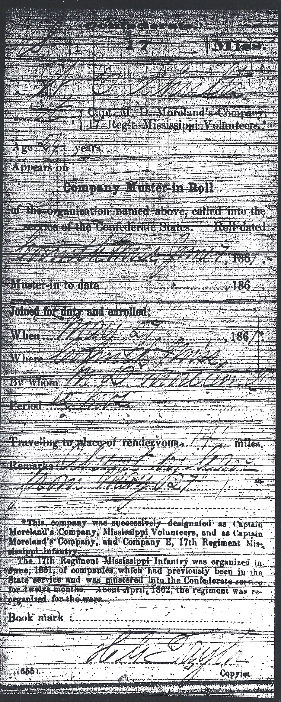 The 17th Mississippi Regiment, Company E was later designated as Captain Moreland’s Company. Micajah D. Moreland, age 34 at the time of mustering in 1861 was probably one of the wealthier citizens of Tishomingo at the time. In the 1860 census he lists real property worth $6,000 and personal property in the amount of $3,630.