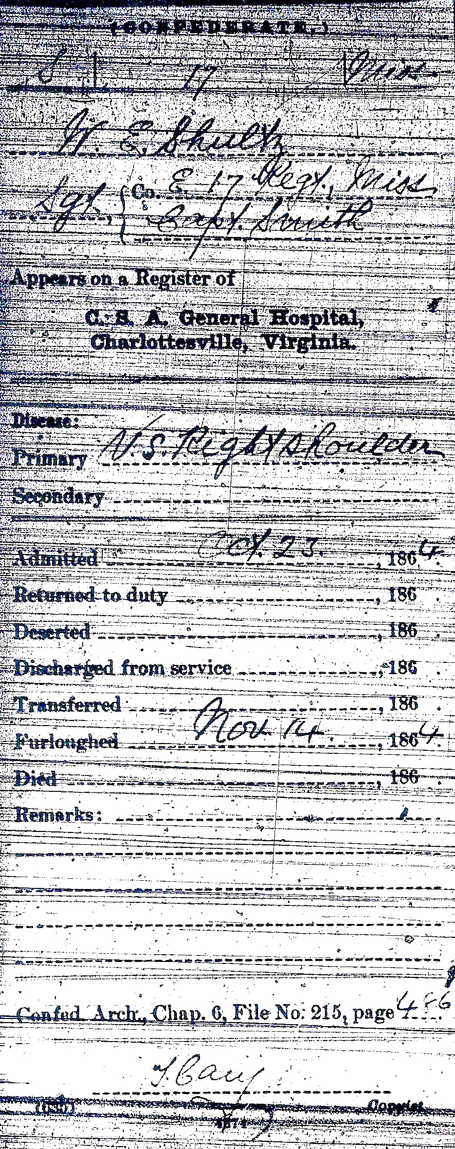 At Belle Grove, the 17th shared the disaster which befell the Confederate Army. Among the soldiers killed or wounded that day was William. William’s Civil War records reflect that on October 23, 1864, he appeared on the register of the CSA General Hospital in Charlottesville, Virginia with a “N S Right Shoulder.” It also shows he was furloughed on November 14, 1864.
