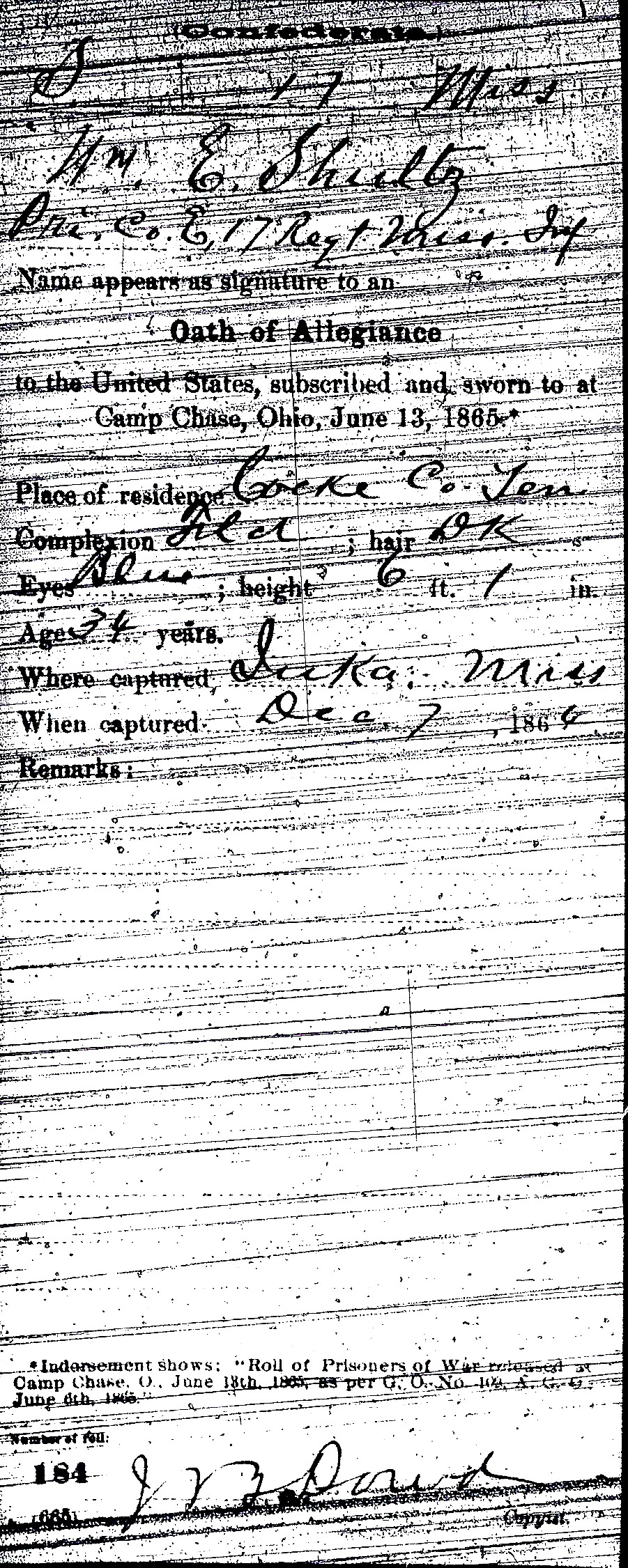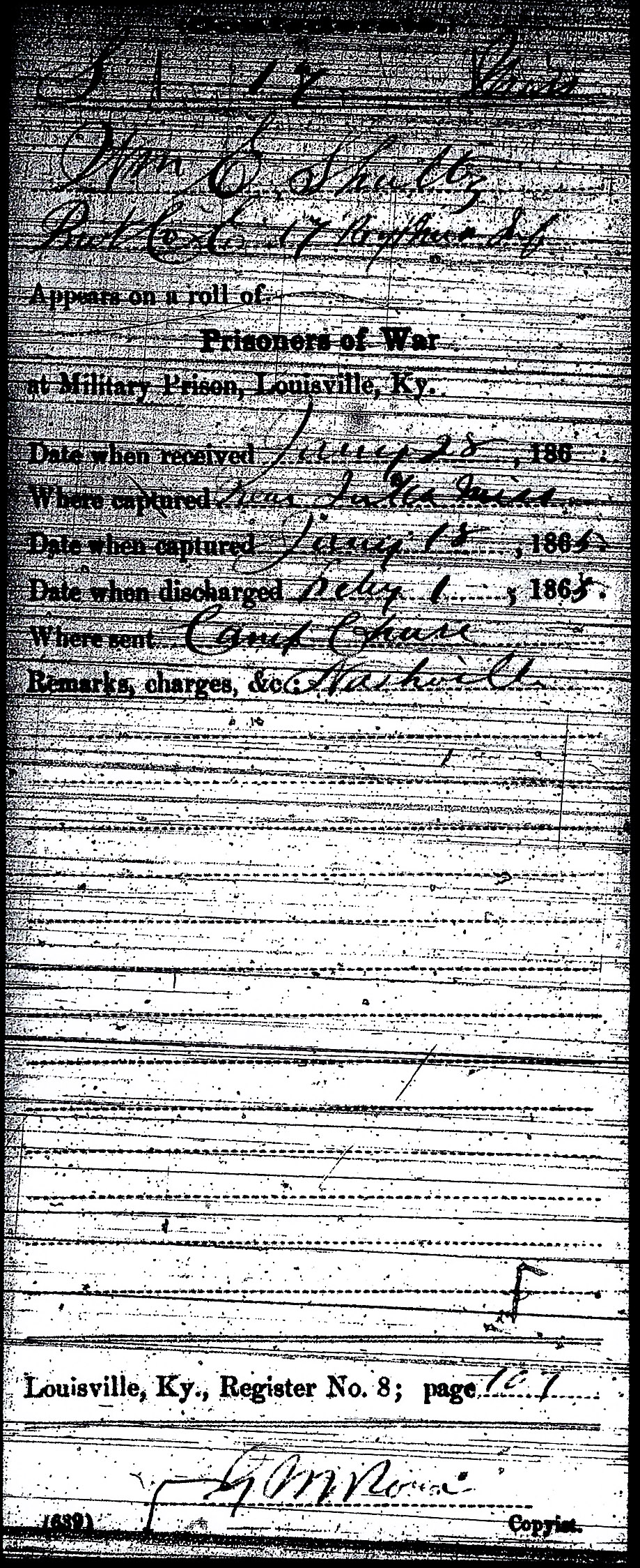 William had received his war wound on October 19, 1864 in the Battle of Cedar Creek and was hospitalized from October 23 to November 14 when he was furloughed. William most likely traveled back to his hometown of Burnsville to see his family. His freedom was short lived as on January 18, 1865, William was captured near Iuka by forces under Major General Thomas, commanding officer, Department of the Cumberland. William spent the next six months as a prisoner of war, first in Nashville Tennessee at the Department of the Cumberland. He was then transferred to a military prison in Louisville, Kentucky then on to Camp Chase, Ohio.
