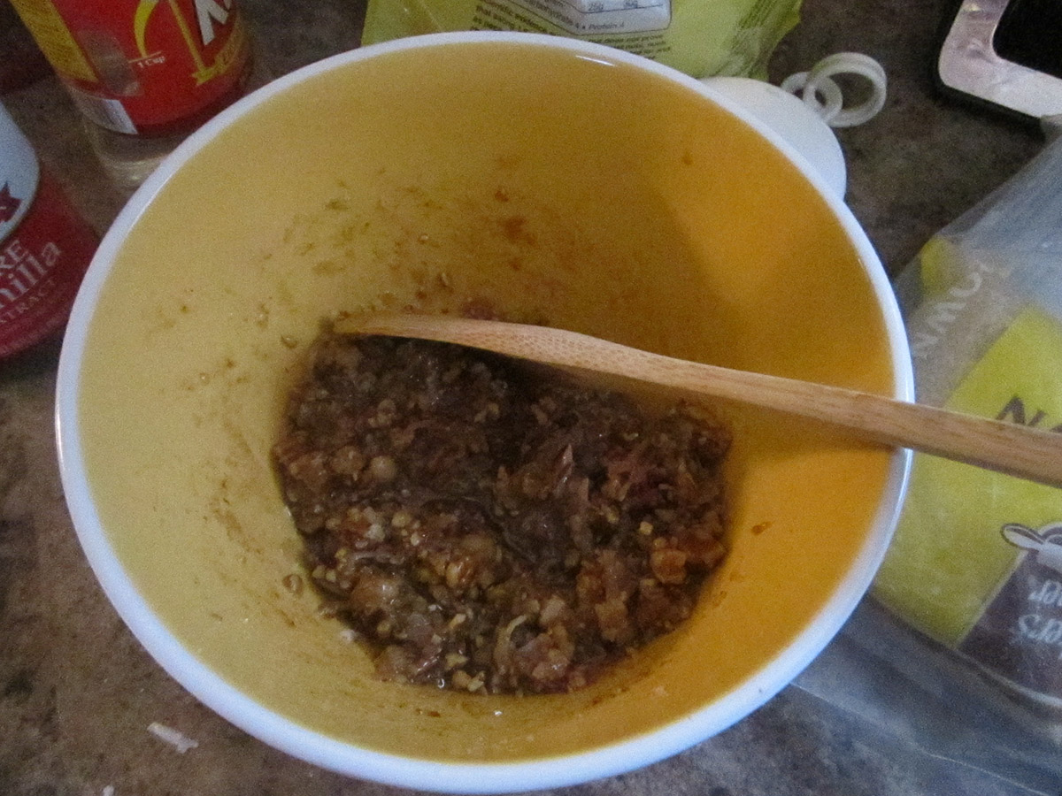 I mixed together 1/3 cup light corn syrup, 1/2 cup brown sugar, 1/4 cup melted margarine, 1/2 teaspoon vanilla extract, 1/2 teaspoon salt, 1/2 teaspoon cinnamon. After that was mixed, I added 1 cup chopped pecans and 1/2 cup flaked coconut. I’d like to say I measure meticulously, but the truth is, I only used a measuring spoon for the vanilla. I eyeballed the rest. My mother taught me how to pour the salt into my cupped palm and judge what amount I have. If you don’t feel comfortable doing that, do it the right way. 😉