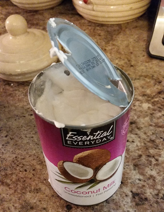 The can says “coconut milk, first pressing.” I just assumed it would pour out like sweetened condensed milk so I used the old fashioned triangular can opener. Wrong. It didn’t pour at all so I opened the top with can opener and I definitely wasn’t prepared for the heavy pudding like substance inside. Not knowing what else to do, I just spooned it out and used it that way. I was also surprised that it did not have a sweet taste. Of course, I had to google “first pressing” to see what that meant. According to what I read here on the ultimate guide to everything, i.e., the internet, “first pressing” means pieces of the meat that are grated, soaked in warm water and then strained to produce thick coconut milk.