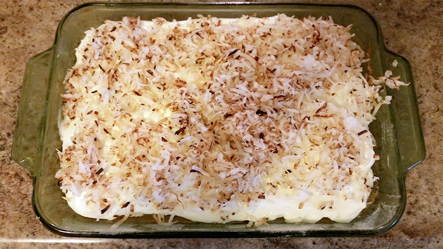 I used the skillet method for toasting my coconut and found it to be much easier then having to pull the pan repeatedly out of the oven. I used coconut extract instead of vanilla and found it to give the icing a wonderful light flavor.