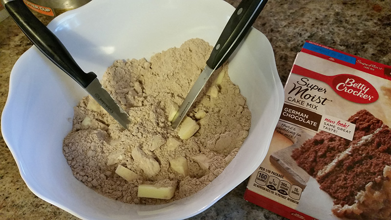 Place the cake mix into a medium size bowl and combine butter with a pastry blender or knives or a food processor until mixture resembles coarse meal. (A pastry blender is definitely on my “to buy” list”.)