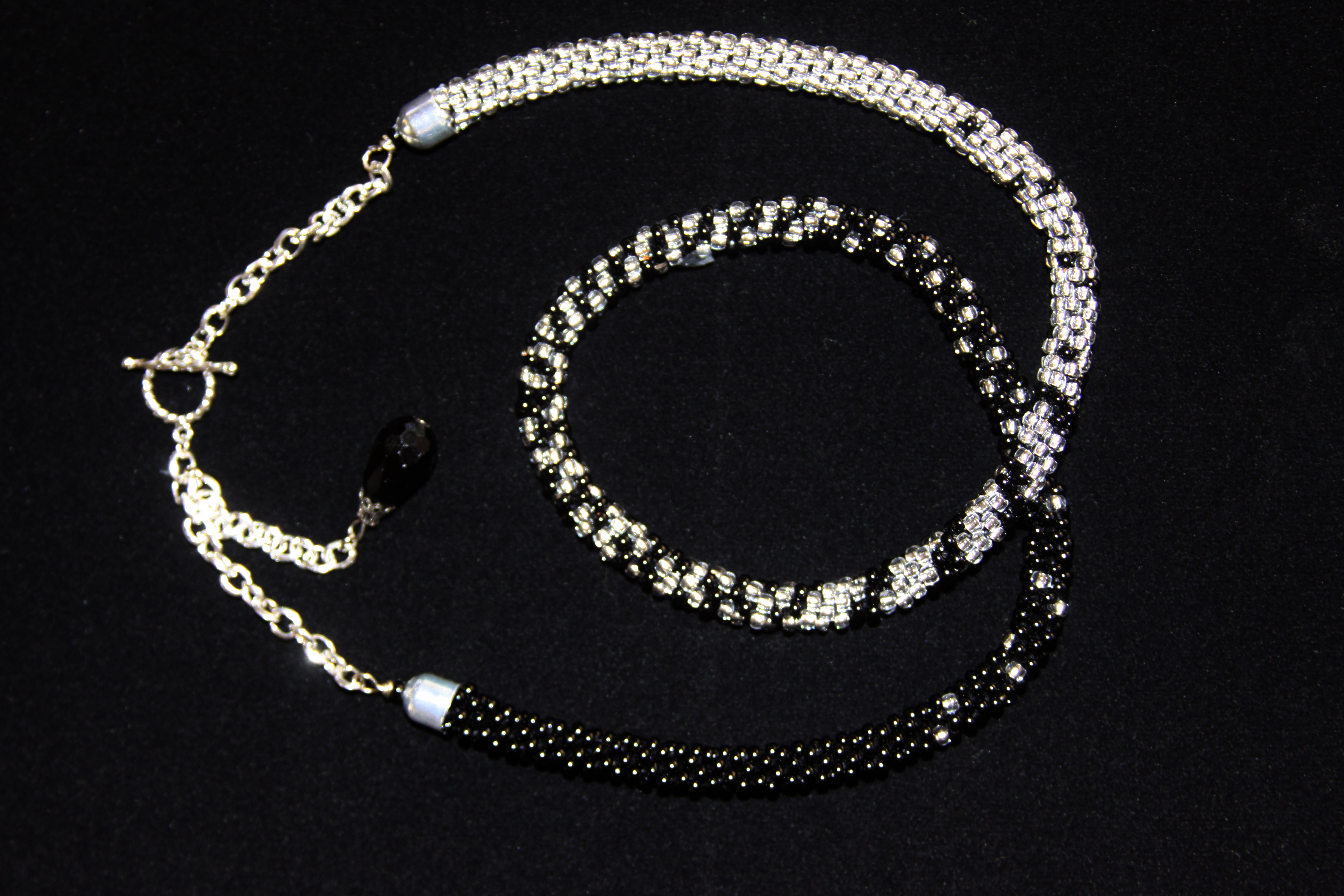 November 4, 2014November 4, 2014corley598 Silver and Black Kumihimo This necklace is made from black and silver size 8 beads in a varigated Kumihimo pattern ranging from all black to all silver. Silver toned bullet endings are attached to silver tone chain for additional length. Share this: Click to share on X (Opens in new window) X Click to share on Facebook (Opens in new window) Facebook Click to print (Opens in new window) Print Click to share on Pinterest (Opens in new window) Pinterest Click to share on Print & PDF (Opens in new window) Print & PDF Like Loading... Related