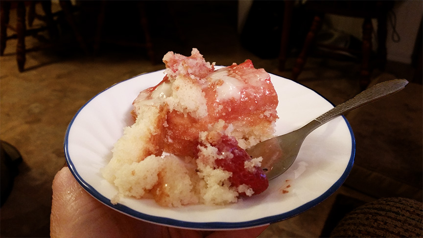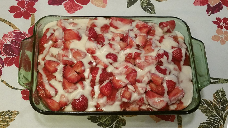 I used a white cake mix and baked it according to the directions. After it had cooled, I took some of the strawberries and most of the sugar juice and put it in a saucepan to heat. I mixed about 2 tablespoons of corn starch with just enough water to mix it into a creamy texture (you may need to add more or less depending on the amount of liquid you have in your pan) and added it to the strawberries and cooked them until the juice had thickened. Using the round handle of a wooden spoon, I poked holes all over the cooled cake and then poured the thickened strawberry and juice over it. I spread the strawberries around to make sure the juice got into all the holes poked in the cake. I then spooned the remaining strawberries onto the cake.