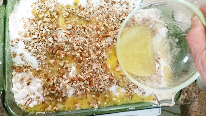 Sprinkle chopped nuts over the cake mix. Drizzle top with melted butter or margarine. Bake in 350° oven for 35 or 40 minutes.