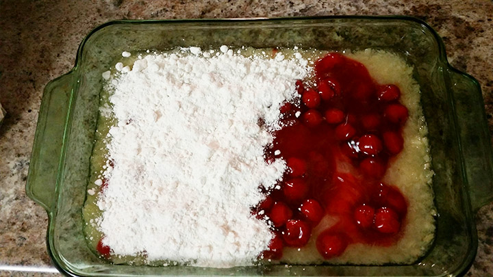 In a 9×13 inch pan mix cherries and pineapple. Sprinkle dry cake mix over pineapple and cherry mixture.