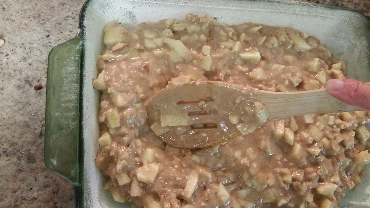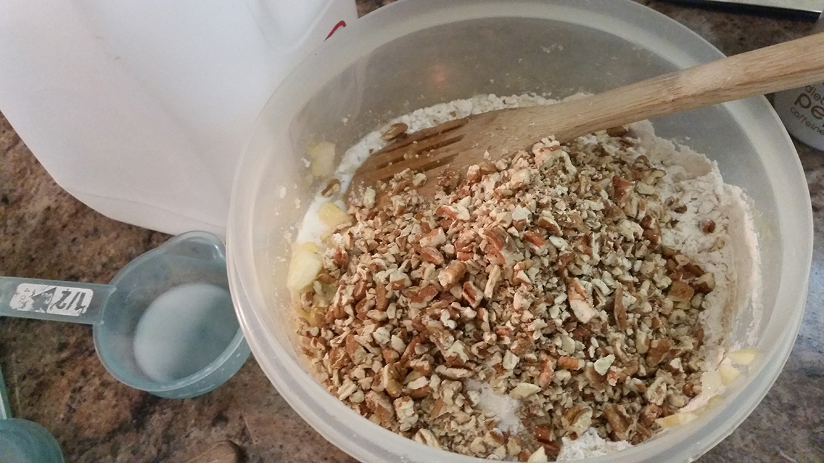 In another mixing bowl combine flour, baking powder, baking soda, cinnamon, nutmeg and salt. Add the flour mixture to the apple mixture. Add milk and stir until jum combined. Add chopped pecans.