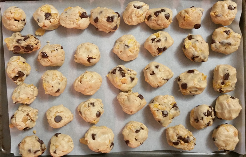 3. Scoop 2 tablespoon balls of cookie dough onto a cookie sheet covered in wax or parchment paper. No need to spread the balls out, you’re just going to chill them.