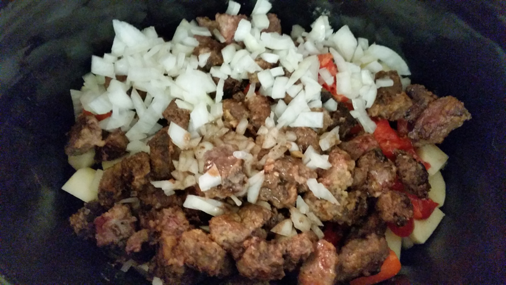 2. Peel and dice potatoes and put them along with the carrots in the bottom of the crockpot.