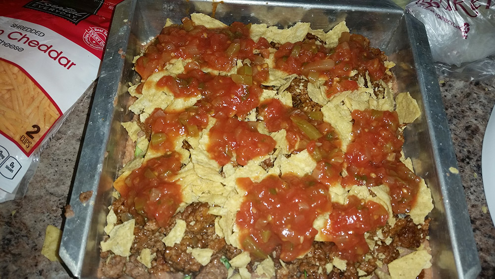 Layer refried beans in an oven safe pan (I used a 9″ square cake pan). Crush tortilla chips and sprinkle on top beans to form a layer.