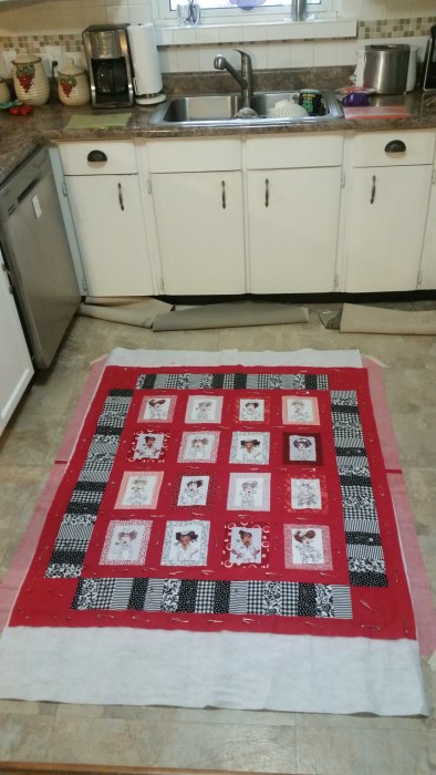 One of the hardest parts of quilting for me is making the quilt sandwich…at least when it’s done on my hands and knees on my kitchen floor. I’ve investigated other methods, but as of yet, I haven’t found one that I thought would work better.
