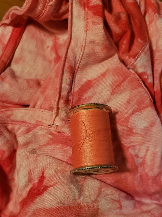 After she passed away, I was given all of her sewing supplies. She must have had every color thread in the rainbow. She like to wear pastels and had polyester suits in most of those colors. I still have most of her thread. I don’t use them; I’m not a pastel person, although I do like shades of pink and coral. I had a shirt I needed to repair this morning, so I went to Mom’s pastel stash, and sure enough, I found the perfect color!