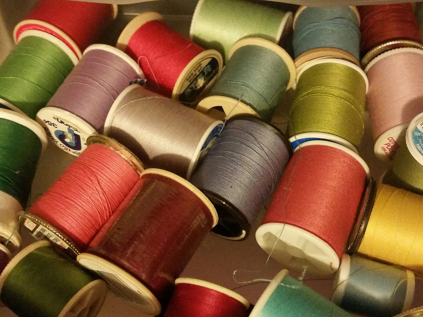 After she passed away, I was given all of her sewing supplies. She must have had every color thread in the rainbow. She like to wear pastels and had polyester suits in most of those colors. I still have most of her thread. I don’t use them; I’m not a pastel person, although I do like shades of pink and coral. I had a shirt I needed to repair this morning, so I went to Mom’s pastel stash, and sure enough, I found the perfect color!