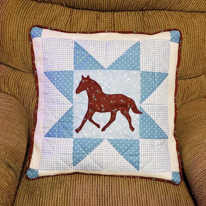 A friend of mine recently became a stable keeper at a horse rehab facility. Several friends and I got together to give her a housewarming party. We each bought something for a potluck meal and I decided I wanted to make her a special gift. I came up with this applique horse on a star background for the front of an 18″ pillow with contrasting piping.