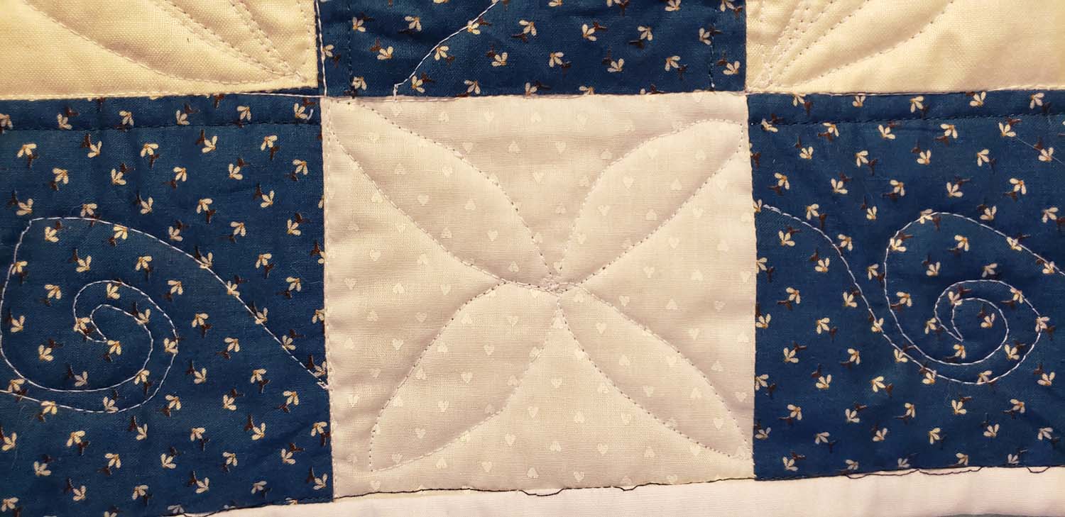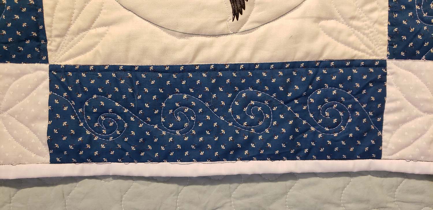 I machine quilted the entire top using several different free motion quilting patterns. I’m not very good at it but it is true that the more you do it, the better you become. The stitching I did near the end was much better than those in the beginning. It isn’t something I’d want to give away; I used it more as a learning experience. And what I learned from this experience is that I will not again attempt to machine quilt something this large on my regular sewing machine.