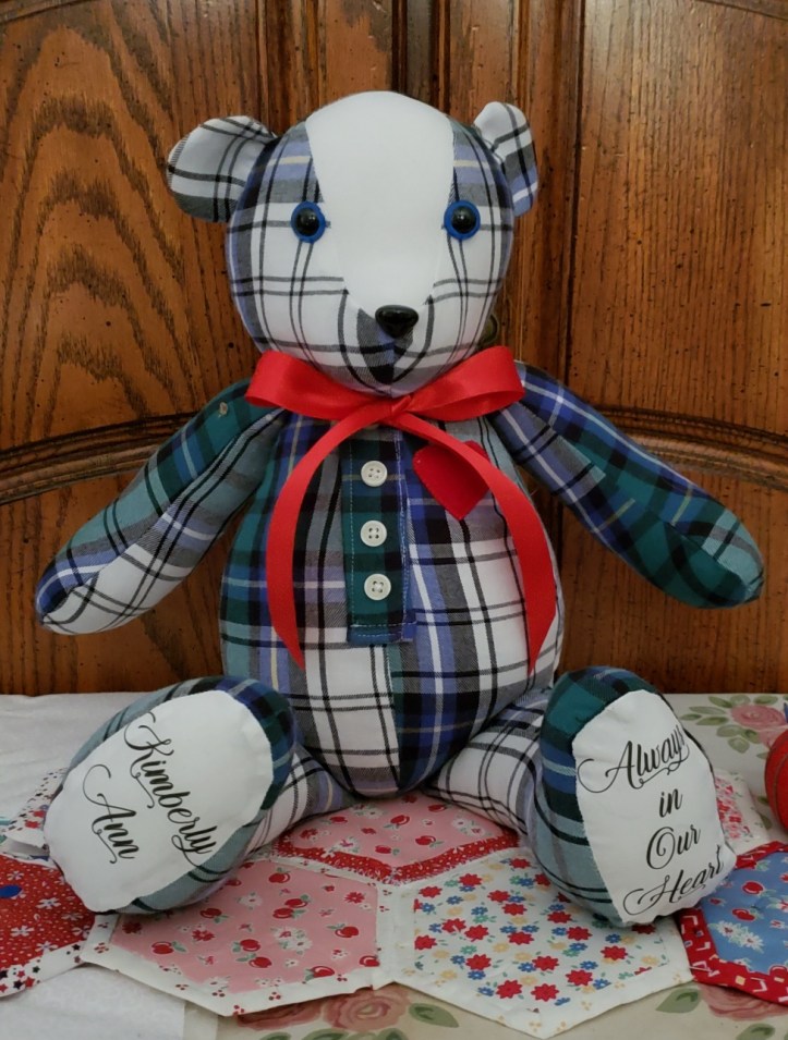 In my post, Memory Bear–He Loved Her First, I wrote about making a memory bear for my husband from the plaid shirts that belonged to his daughter. Although she referred to herself as “Kimber” as did most of her friends down in her hometown of Cape Girardeau, her dad would often say “I didn’t name her Kimber, I named her Kim.” So that is what she was always known to us. But when it came to making her memory bears, I had to use her name “Kimberly Ann” because that is who is in my heart.