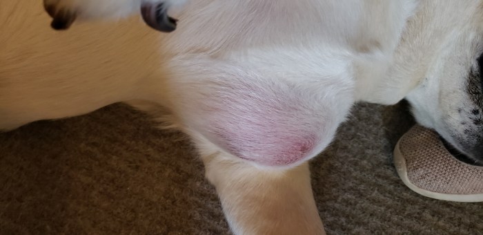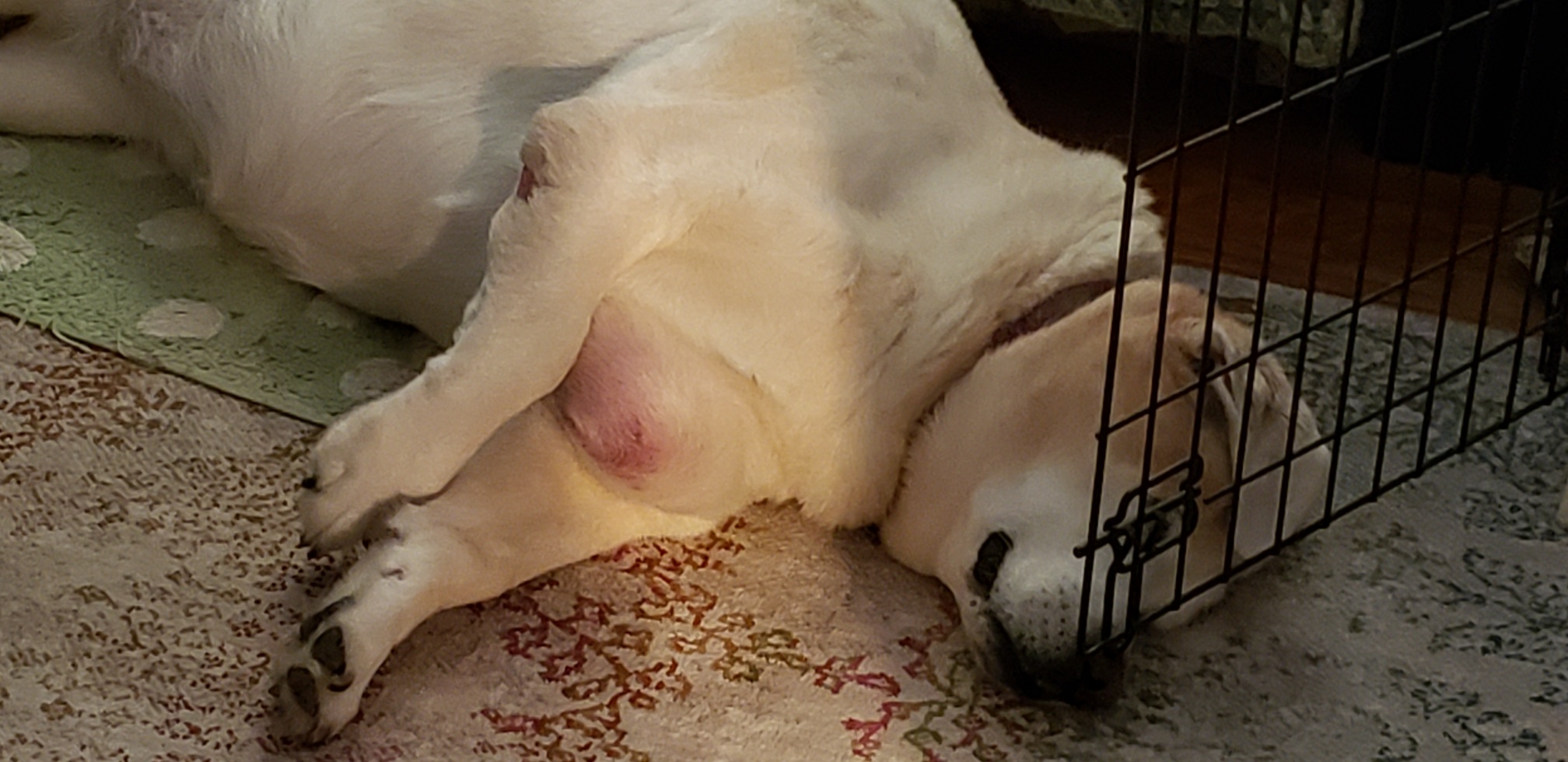Our nine-year-old Labrador, Lily, has a number of these lipomas in different areas of her body. The one that was most concerning was a very large one growing on her chest just beneath her left arm pit. She’s had this lump for several years, but in the past year, it seems to have doubled in size. It had gotten so large that it was causing her problems in using her front leg and we were afraid with its size, it might be pressing on her rib cage.