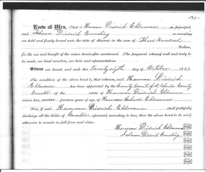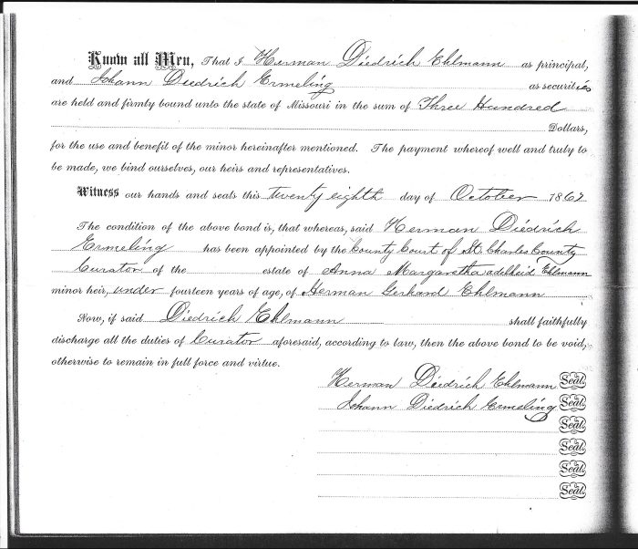 On October 28, 1867 Probate records show that Herman Diedrich Ehlmann (1827) was appointed curator of the estates of Herman Diedrich (1856) and Anna Margaretha Adelheid Ehlmann, minor heirs of Herman Gerhard Ehlmann.