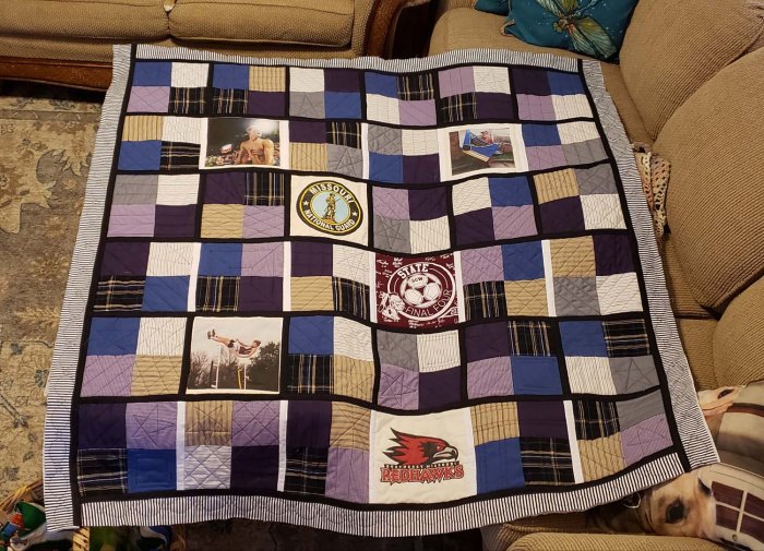 I’ve tried to keep myself more positive and do things that make me feel fulfilled and useful and still a part of this upside-down, topsy-turvy world we are living in. Things that will keep the angry monster at bay that rears its ugly head at times that I don’t even feel it coming on. To help with that, I decided to make a memory quilt for my grandson for Christmas. He’s all grown up now and will be leaving for boot camp in January. I look at him and can’t believe it. Where has time gone?