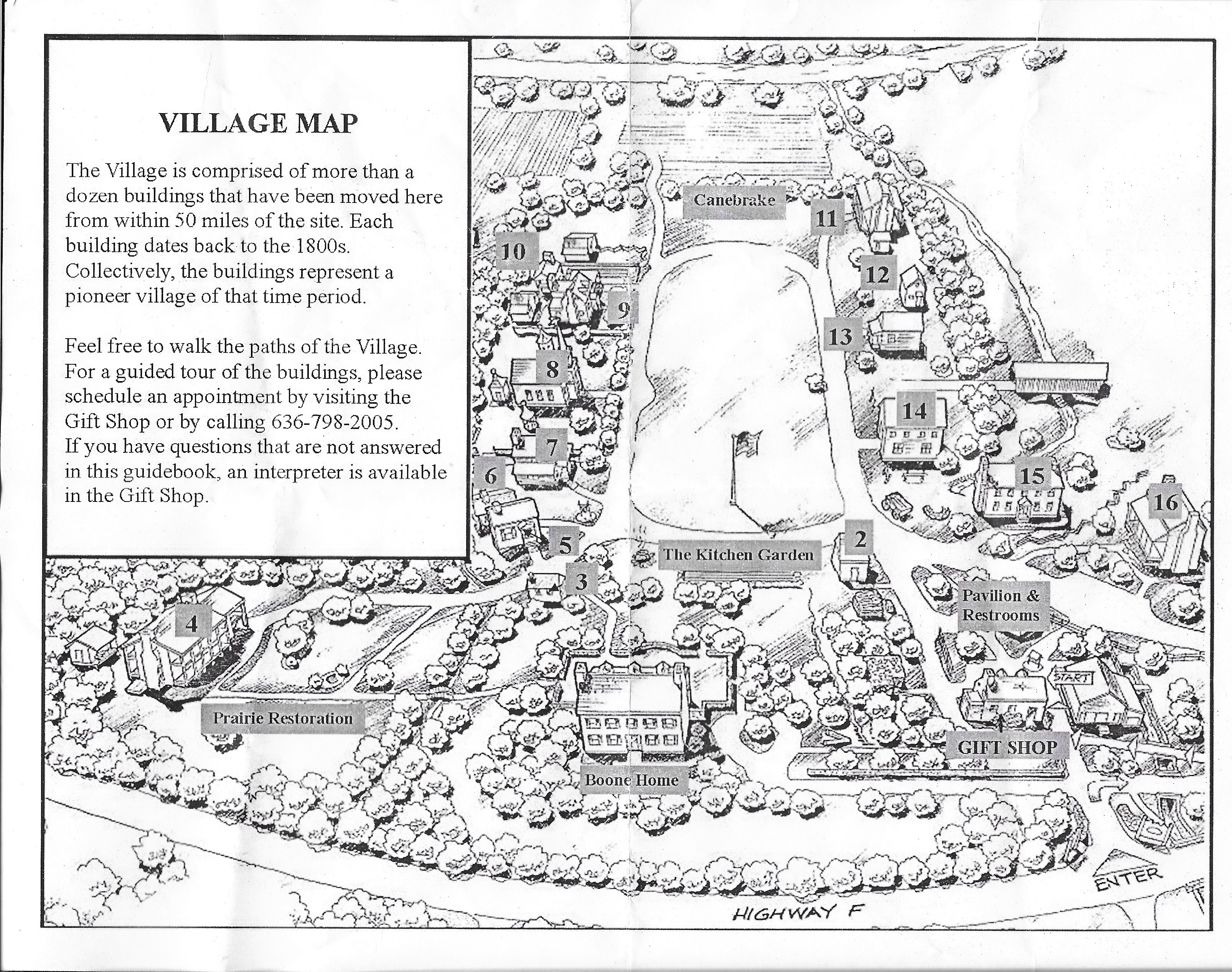 - Daniel Boone Home, c. 1803-1810; 2) Squire Boone Home, Old Monroe, MO, c. 1802; 3) Mount Hope School House, St. Paul, Mo., c. 1838; 4) Sappington-Dressel Home, Sappington, MO, c. 1850; 5) Dressmaker Shop, St. Charles, MO c. 1850; 6) Potter’s shop, c. 2000, reproduction; 7) Carpentr Shop, Flint Hill, MO c. 1837; 8) Old Peace Chapel, New Melle, MO 1850; 9) Stake House, defiance, MO c. 1828/1836; 10) Detached Kitchen, c. 1837, 11) Engledew House, c. 1840; 12) The Land Office, Schluersburg, MO, c. 1850; 13) General Store, Schluersburg, MO, c. 1840; 14) Grist Mill (Borgmann Mill; Marthasville, MO) c. 1846; 15) Jemima Boone Callaway House, Marthasville, MO c. 1811; 16) Newton Howell House and Exhibit Gallery, Warren County, MO c. 1820.