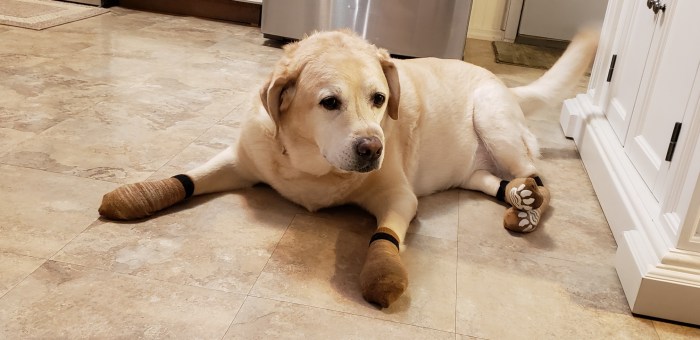 Molly began having problems with arthritis in her elbows about two years ago. For a while, it was mostly manageable with a medication called Previcox and an occasional cortisone shot. She was having problems walking on our tile floor so to combat that, I had floor rugs throughout the house in all the directions she normally walked. My son insisted that we needed to buy her gripper socks to help her walk and it did, a little.
