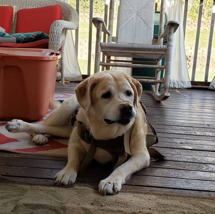We were looking forward to going on vacation to the resort we had gone to the last two summers and knew that the rooms we were getting, literally right at the lake’s edge, did have a steep downhill path that also included a small number of stairs. To help with this, I bought her a tactical vest that comes with a handle on her back which let us help her up and down the stairs.