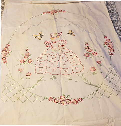 I wanted to find out something about this pattern to possibly be able to date it, but as of yet, I can’t find anything. There are similar “Southern Belle Crinoline” patterns by the Bucilla Corporation, dating back to the 1940s and earlier, but none identical to this one.