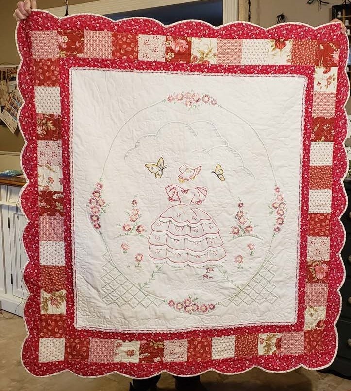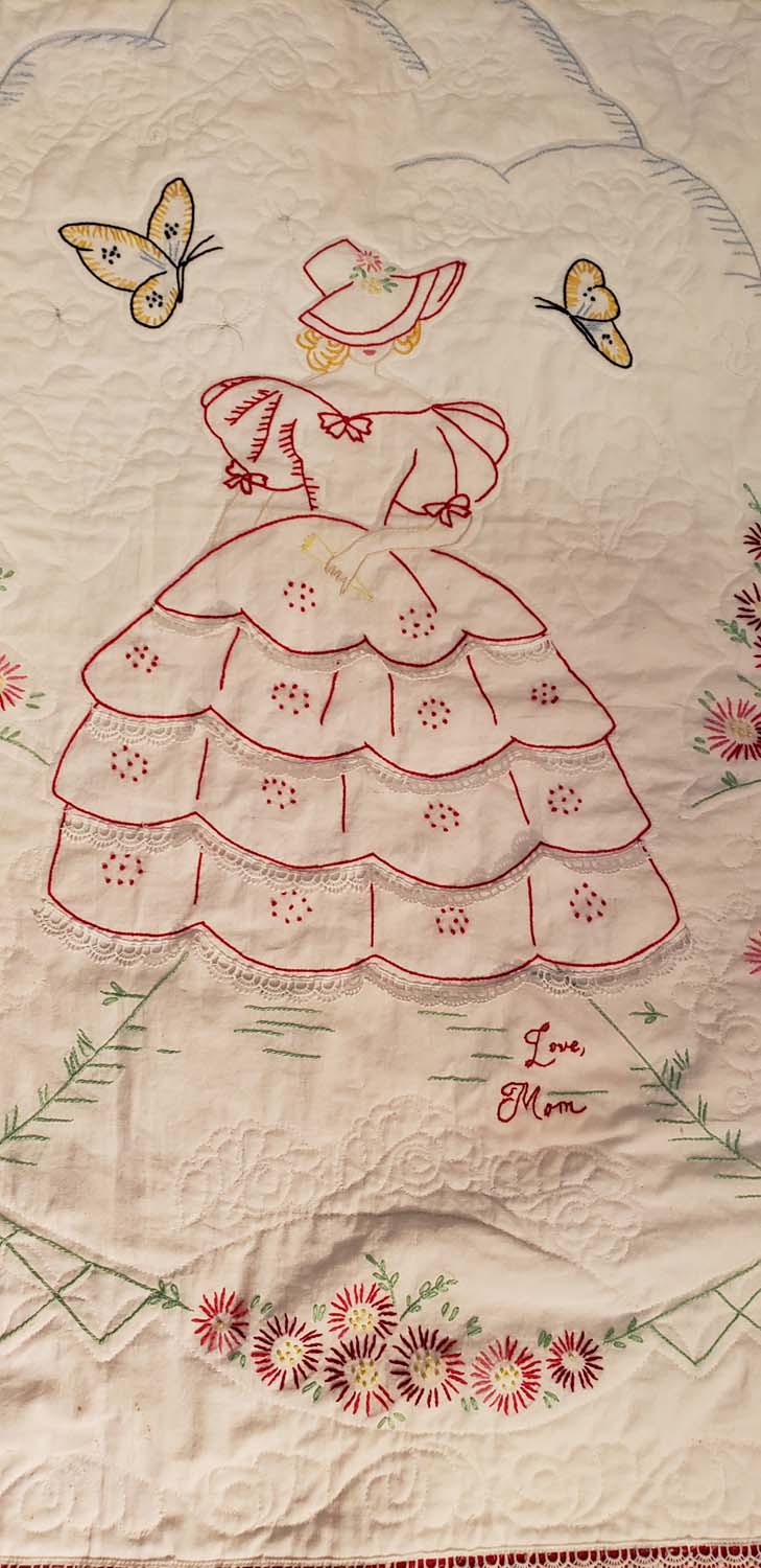 My mom passed away in 1987. After she died, I was given all of her sewing supplies, fabric, notions and whatnot. My brother got her 1948 Singer sewing machine in its original wooden cabinet because I had nowhere to put it. When I was going through her fabric I found this embroidered quilt top. I have a vague memory that she embroidered this for my daughter.