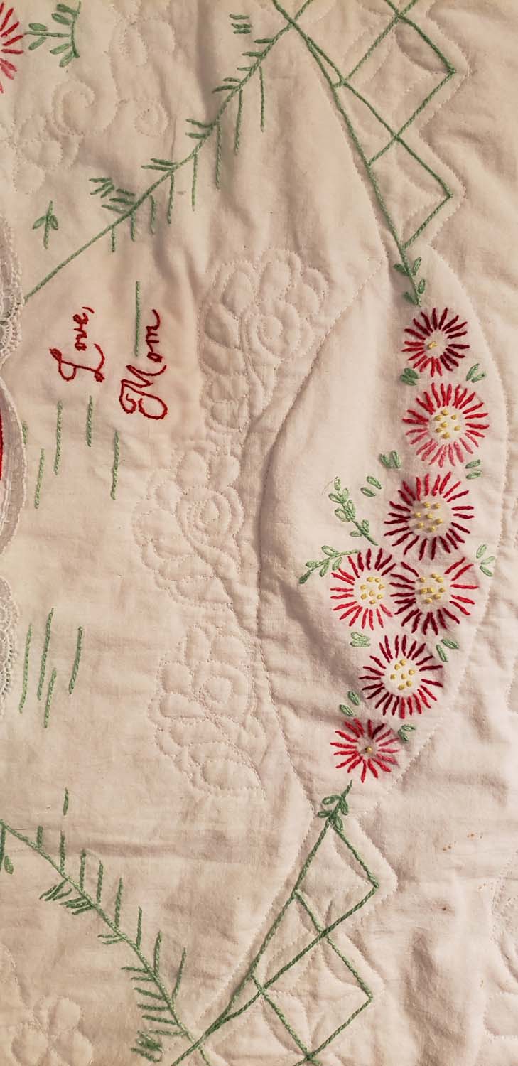 After I originally received this quilt top, I packed it away and forgot about it. A couple years ago, I was going through some boxes in the basement and found this quilt top again. So I did what any responsible adult would do, I packed it away again. I started quilting two years ago and after seeing a photo of an embroidered quilted top, I remembered the quilt top and finally knew what I wanted to do with it. I went to the basement to the box I thought it was in, and, it wasn’t there. I looked through all my boxes in my basement closet and couldn’t find it. I was devastated and couldn’t understand how it wasn’t there. Did I accidentally throw it away? That thought made me sick. A couple months ago, I was in my “mom cave”, i.e., my sewing room, and I was looking for some fabric in a large bin. I was digging through the bottom of it and omg, there was my quilt top!