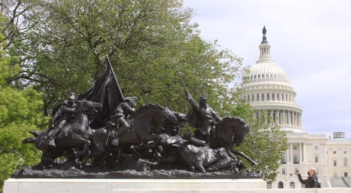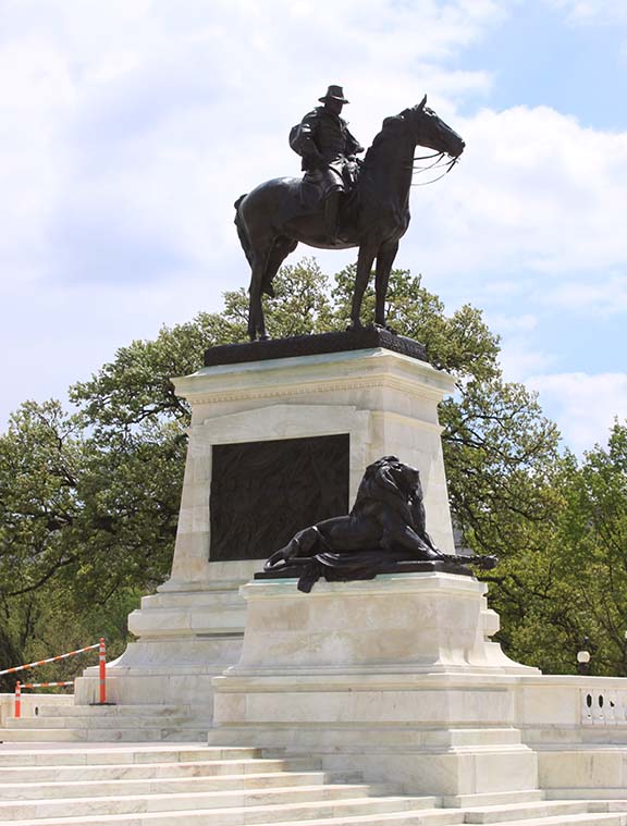 To Grant’s right is the famous Cavalry Group rushing out onto the battlefield. The lead horse carries the commanding officer who, with a drawn sword, is giving the command to charge. Tragically, one of the horses has already fallen, pinning its rider beneath.- Lincoln Memorial
