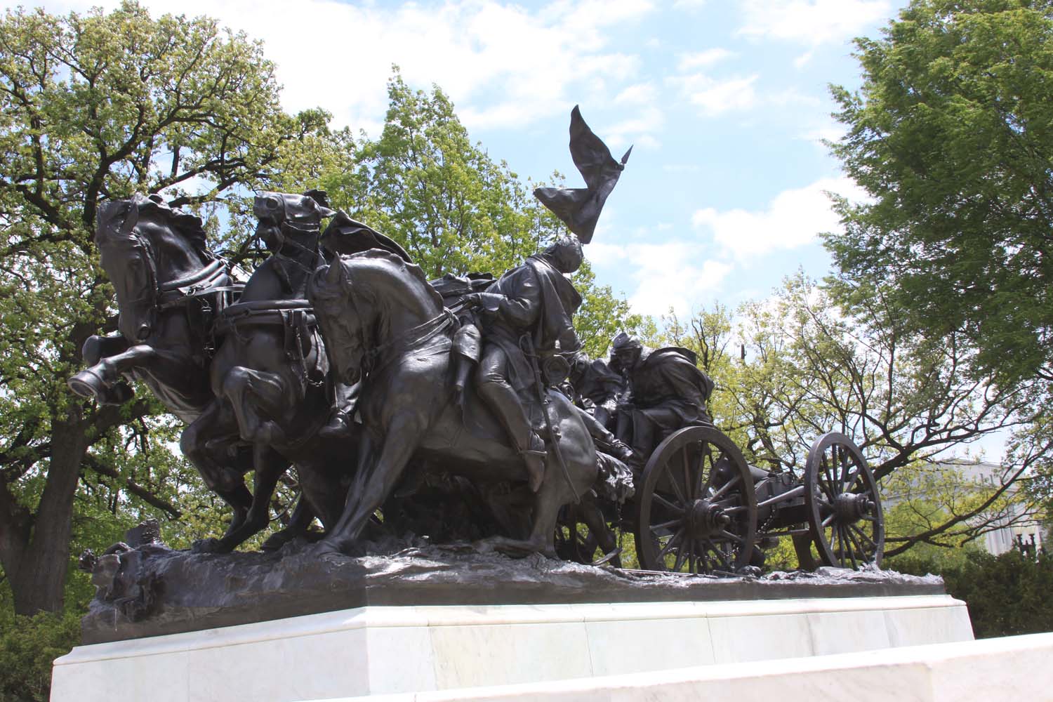 To Grant’s left is an equally dramatic portrayal of the Artillery group. Five men and three horses attempt to steer a cannon into position, but the bridal of the lead horse has broken, causing it to lunge forward and the driver to lose control. (https://historicsites.dcpreservation.org/items/show/260)