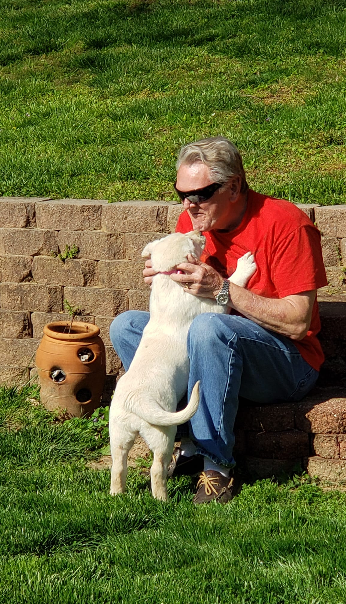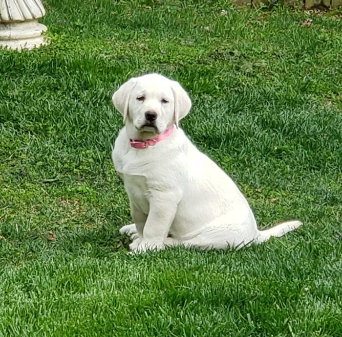 We are so thrilled. On Sunday we were able to bring our new baby, Millie, home. She is a yellow labrador that is so light in color she almost looks white. And although she looks white, the American Kennel Club, still considers her a “yellow” lab. She’s a little over ten weeks old and she’s a tank at around 25 pounds. She’s almost too heavy to pick up and carry. When we first saw her when she was six weeks old, her breeder said that she was the largest of the litter and he wouldn’t be surprised if she weighed 125 when she was fully grown. That wasn’t totally intimidating as both Molly and Lillie weighed right around 100 pounds. (Lillie, we discovered several months before she died, had hypothyroidism which accounted for some of her weight.)