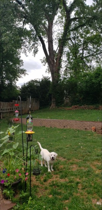 Walking through the yard, we could see that pieces of bark had exploded across the yard. I’m so thankful I wasn’t home when this happened. It would have definitely sealed the fate of this tree. Now, it’s up in the air as to whether or not the tree will stay. The defining factors are the cost of removing it (upwards of $8,000) and what internal (if any) damage done to the tree. So far, a week later, the tree doesn’t appear to be traumatized other than one of the vines growing up the side. I would have been happy if it had killed them all.