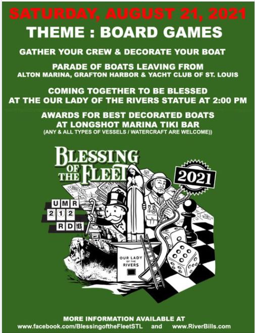 The first pleasure Boat Blessing materialized as a result of a flood that threatened Portage des Sioux in the early 1950’s. The towns’ parish, headed by Rev. Edward Schlattmann, prayed together to the Virgin Mary for the town of Portage des Sioux to be spared from the perils of the raising waters. They together coined a name for the Virgin Mary, Our Lady of the Rivers. As history records, the flooding waters parted and traveled just above and below the river town without entering it. To pay tribute to their Lady, the town people and parishioners, Schlattmann and local businessmen and local boatmen formulated plans for the first religious fiberglass statue. Blessing of the Fleet