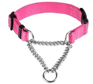 A training collar is a combination of a regular leather collar and chain. When the leash is attached to the chain, it pulls the collar tight around her neck. It doesn’t hurt her although she sounds like she’s choking but it does slow her down.