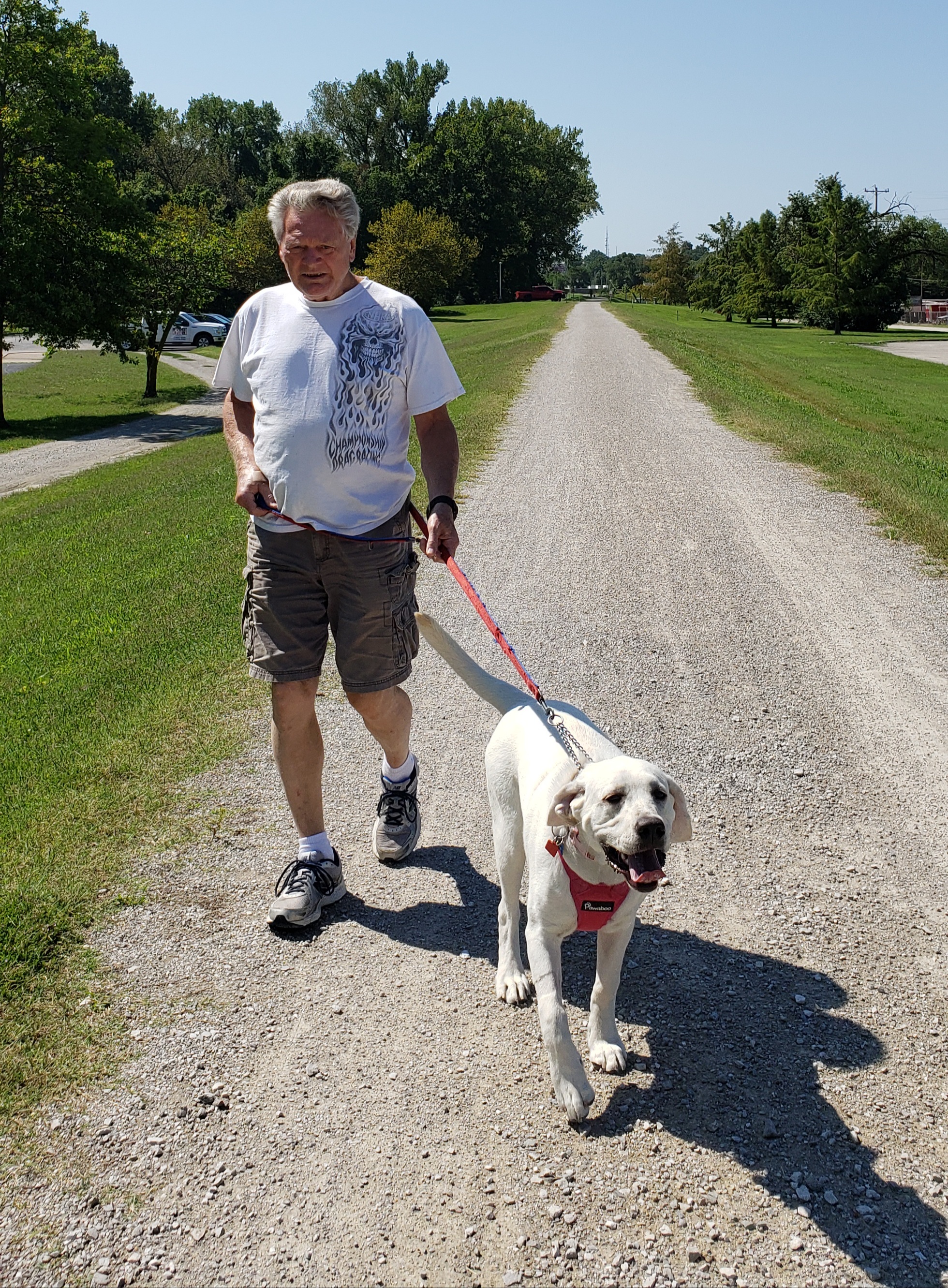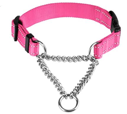 A training collar is a combination of a regular leather collar and chain. When the leash is attached to the chain, it pulls the collar tight around her neck. It doesn’t hurt her although she sounds like she’s choking but it does slow her down.