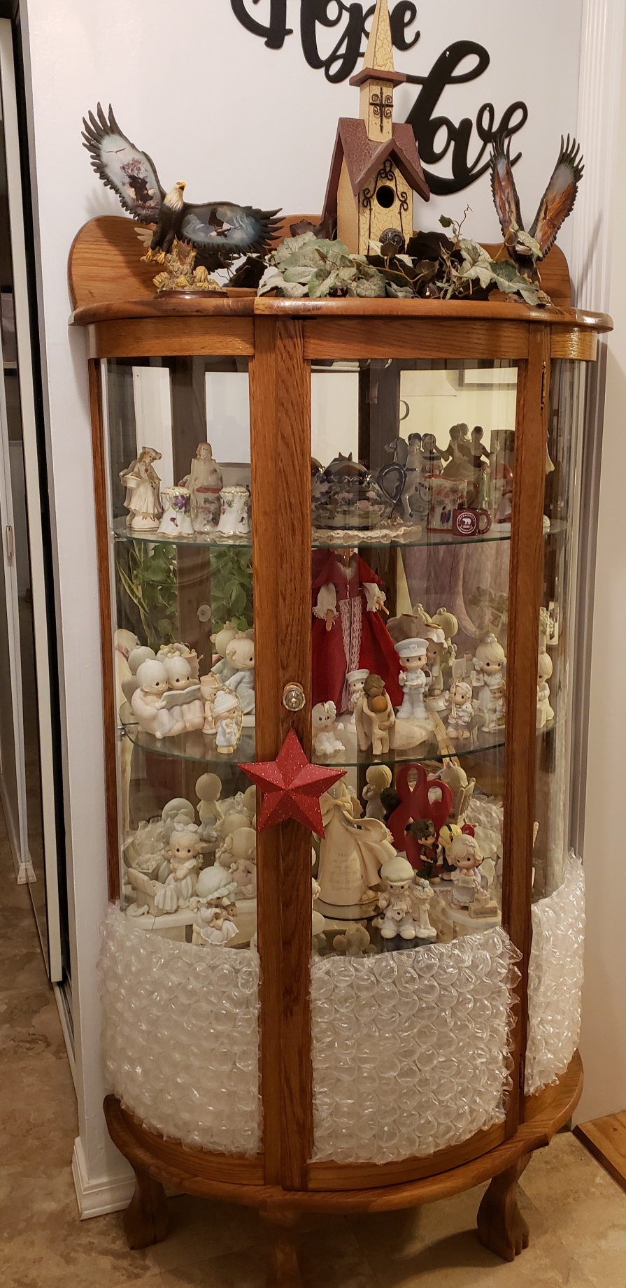 She’s already cracked the glass in my pride and joy, my replica curved glass curio cabinet. I was so upset and it was something that I was afraid would happen. The curio sits in my entry hall and when people come through the front door, there isn’t a whole lot of room for people and a large dog who is trying to wag her tail off and jump up on the poor unsuspecting visitors. The night before she cracked it, I was laying in bed thinking about different ways to maybe safeguard the glass from her wicked tail, but, that’s all I did, think about it. Unfortunately, the next day in her excitement to greet my son and his dogs, she beat her tail on the glass one too many times and it cracked. Now the glass in the bottom third of the cabinet is wrapped in two layers of bubble wrap and I am avoiding people coming in the front door if Millie isn’t corraled somewhere other than the entry hall.