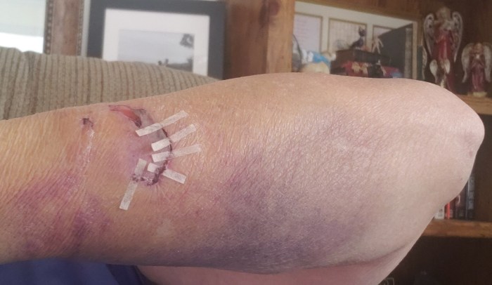 By far, my worst injury is to my left forearm. The skin was just peeled back. When I was at the doctor the next day, he said the words I’ve always wanted to hear…”you’re pretty thin”. But unfortunately, he wasn’t talking about my physique, he was referring to my skin. Another wonder of getting older (apparently along with balance.)
