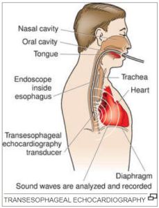 A tube with a device called a “transducer” (that sounds space-age) is passed down into the throat and into the esophagus (the food tube) that connects the mouth to the stomach. The transducer directs ultrasound waves into the heart and the reflected sound waves picked up by the transducer are translated into an image of the heart. Basically, I think what they are looking for is to make sure you don’t have any blood clots lurking in the recesses of the heart before they go poking around in there stirring everything up.