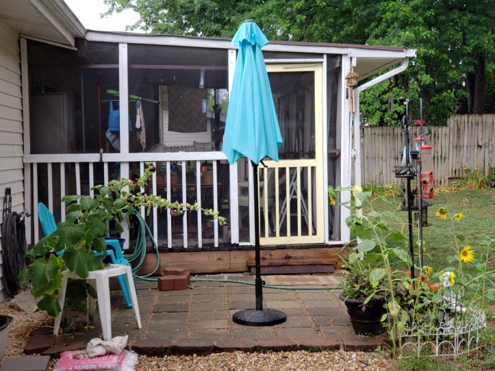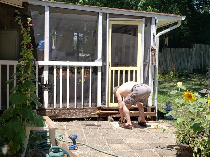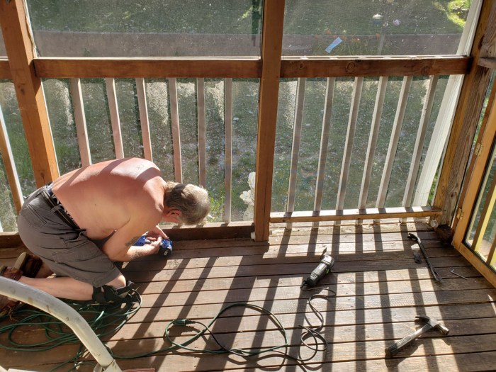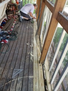 The Great Hunter and I picked a great week to take on a repair project on the deck. The deck is about 30 years old, but since most of it has always been under the roof, the only problem we’ve had is with the ends of the boards. A couple years back, I got the bright idea that I wanted to put a floor on the deck to make it look more like a room. We put down plywood and I covered it with a peel and stick tile. I didn’t think about water getting under the tile (which it did) and rotting the boards underneath (which it did). That was our first deck wood redo a couple years ago. but at the time, we only replaced about six or seven boards.