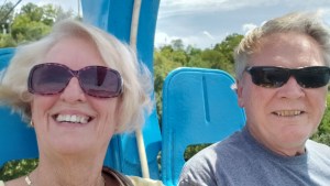 Sunday, Aug. 7–Branson Landing and Parakeet Pete’s Waterfront Zipline across Lake Taneycomo. I’ve never done a zipline before and this ride isn’t a typical zipline. It’s sort of a cross between a zip line and a ski lift. They strap you in by a seat belt and you ride backward, across the Lake to the top of the bluff on the other side. Then they let you go and you descend rapidly to the other side. And when I say rapidly, I mean rapidly. When you reach the platform, it’s like a jet landing on an aircraft carrier and its tailhook being caught. If the seat belt had failed we both would have face-planted into the building. I guess it didn’t bother us enough that we didn’t do it again. They weren’t busy and offered us another ride for free, so we did.