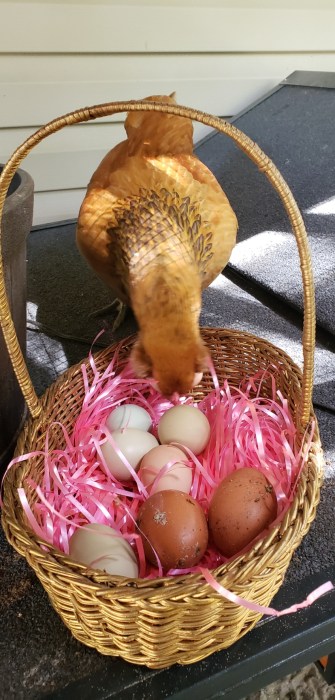 So for the past week, and for the next two weeks, every other day I make the drive out to their house and take care of their chickens. I make sure they have food and water and scoop up their poo and gather the eggs. The other day, I gathered a basket of eggs and left them on top of the coop and when I returned from what I was doing, two of the eggs were out of the basket. One of the chickens, I think it was Peckerhead was standing by the basket. I put the eggs back in the basket, and to my amazement, she took them back out using her beak.