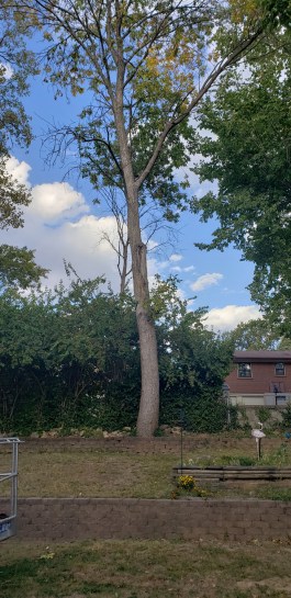 I’ve wanted to have this tree taken down for a lot of years. Several years ago, I had gotten a bid of $8,000 to remove the tree. It was much to expensive for me. Recently, my neighbor was having a tree trimming company come and give him a bid for some work, so I told him to send the guy my way when he was done. The man walked into the yard, looked at the tree and said “that’s a $20,000 tree.” That was lots more than the bid I’d gotten several years back and much more than I could afford. I decided that since I couldn’t afford to have the whole tree taken down I’d settle for removing the most offending (at least in my world) branch that hangs over the house removed, along with another really ugly tree we had in the yard. This tree had lost a large limb in a storm about five years ago and since that time it has become progressively scraggly.