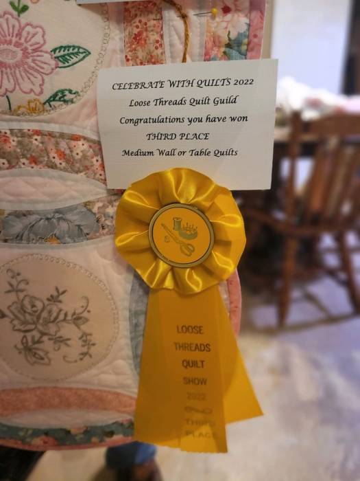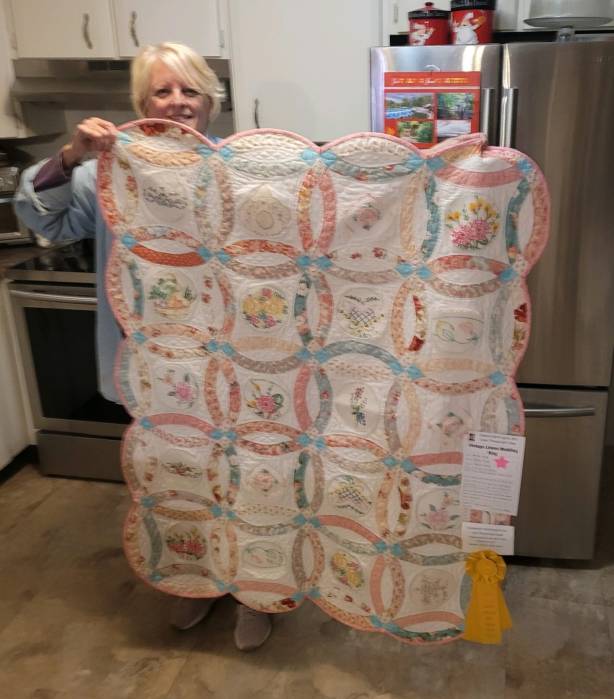 But much to my great surprise, another quilt I entered, won third place in its category of Medium Wall or Table Quilts. It was made in a classic wedding ring pattern and embellished with embroidered and crocheted pieces I picked up at thrift and antique malls. The idea came from a Facebook page “1914 Boehm House Vintage Linens Classes” and instructor Rhonda Cox Dort. I had never made a wedding ring quilt before. It was pretty challenging (sewing curves is definitely on a learning curve) but I enjoyed it. I am very much partial to old fashioned looking things. (Matches my 1916 Singer Trendle sewing machine in my dining room.)