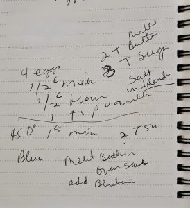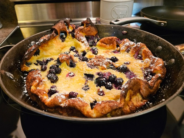 One video led to another and then there was “Blueberry Dutch Baby”. I must have watched that video at least half a dozen times, furiously scribbling trying to write down the recipe only catching several words on each playing.