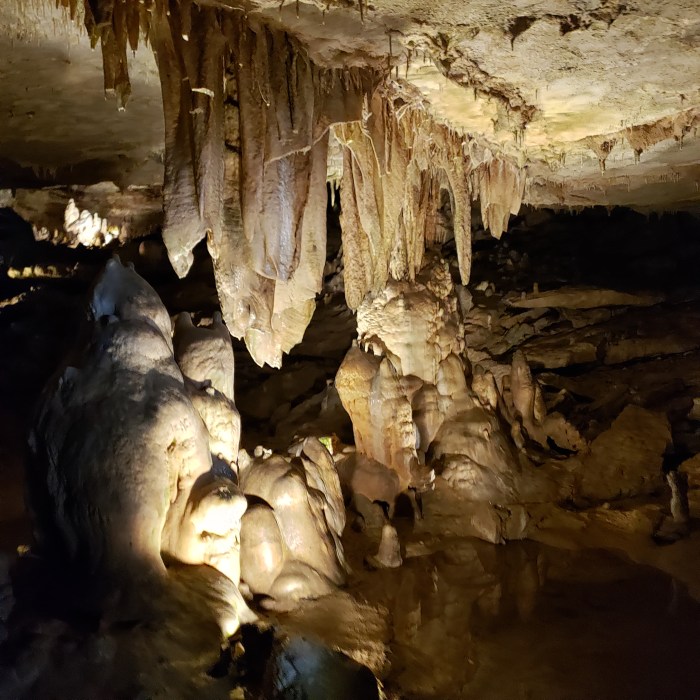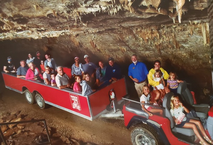 Monday, August 8. We knew some of the things we wanted to do and what days we wanted to do them, so on Monday, we were at loose ends. We decided to drive back up to Springfield and go to Fantastic Caverns. This cavern was different from some of the others we’d gone through because this one was on a tram, a definite bonus for my lazy bones. I knew the Great Hunter really enjoyed caves, and this one did not disappoint him. I’m kind of like, you’ve seen one cave, you’ve seen them all. Stalagtites hang tight to the ceiling and Stalagmites might reach the ceiling from the floor. (All tour guides tell you this.)