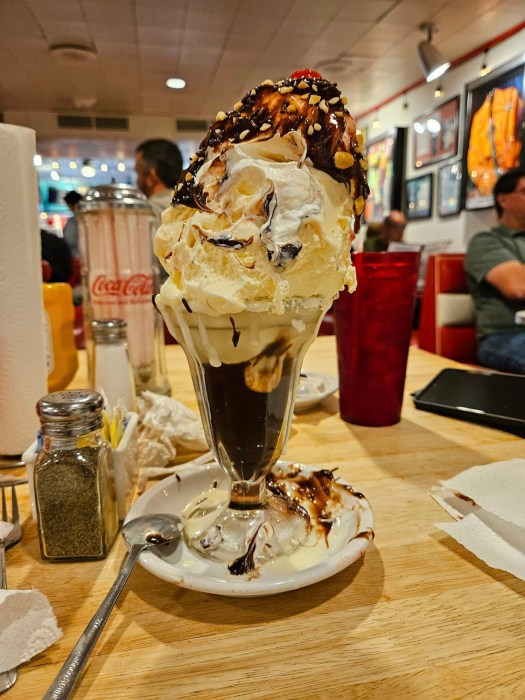 On Tuesday, before the afternoon production, we went to lunch at Mel’s Hard Rock Cafe, where all the servers were also entertainers. The Great Hunter asked one of the female servers to sing Patsy Cline’s “Crazy” for me and she did it wonderfully. We also enjoyed the biggest Hot Fudge Sundae I’ve ever eaten. Of course, we said we couldn’t possibly finish it, but, we did.