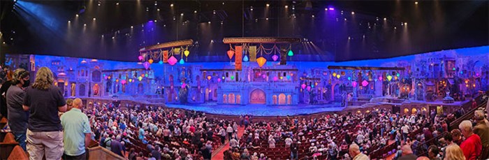 The Sight and Sound Theater’s stage is panoramic on three sides which at times is almost overwhelming. You don’t know where you should look first. The theater seats 2,000 people and almost every seat was filled. Although our seats were five rows from the top, they were really good seats, almost in the exact center of the stage. The music was beautiful (but a little loud–the lady beside me kept putting her fingers in her ears); the costuming was breathtaking with lots and lots of “sparkles and bling” (and I love bling) and of course, live horses trotting on and off the stage with their costumed riders.